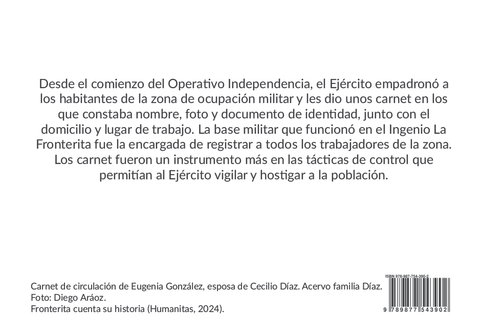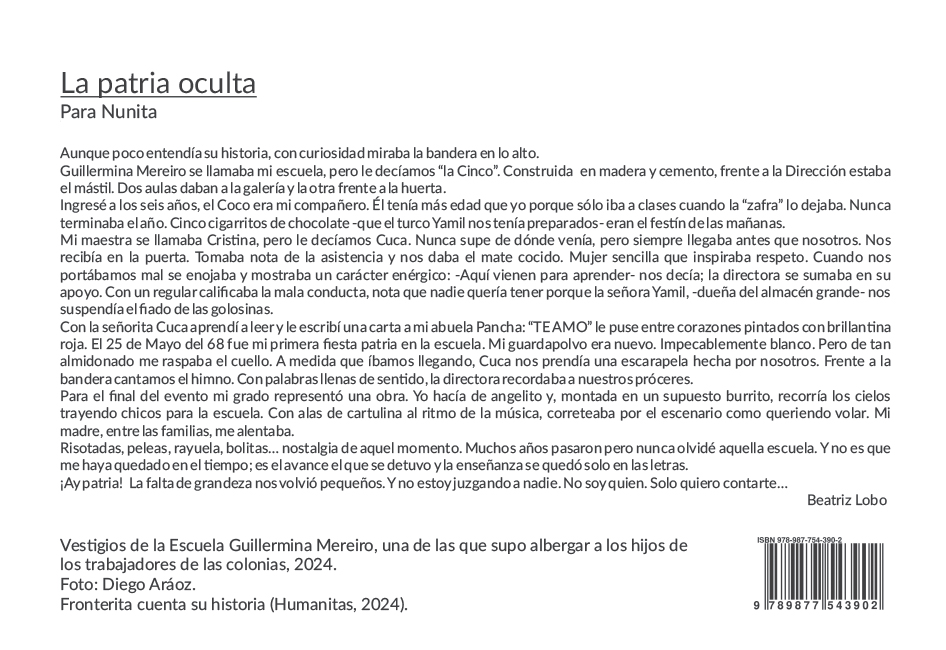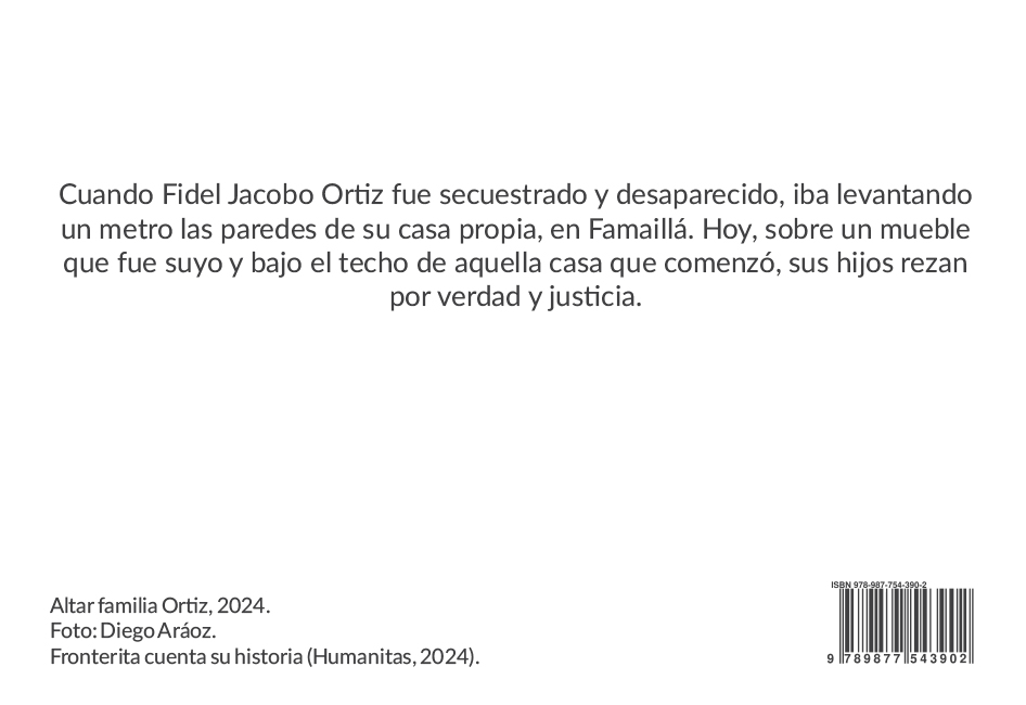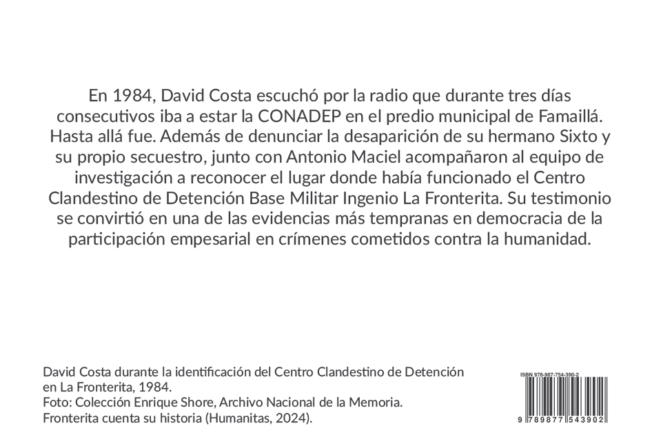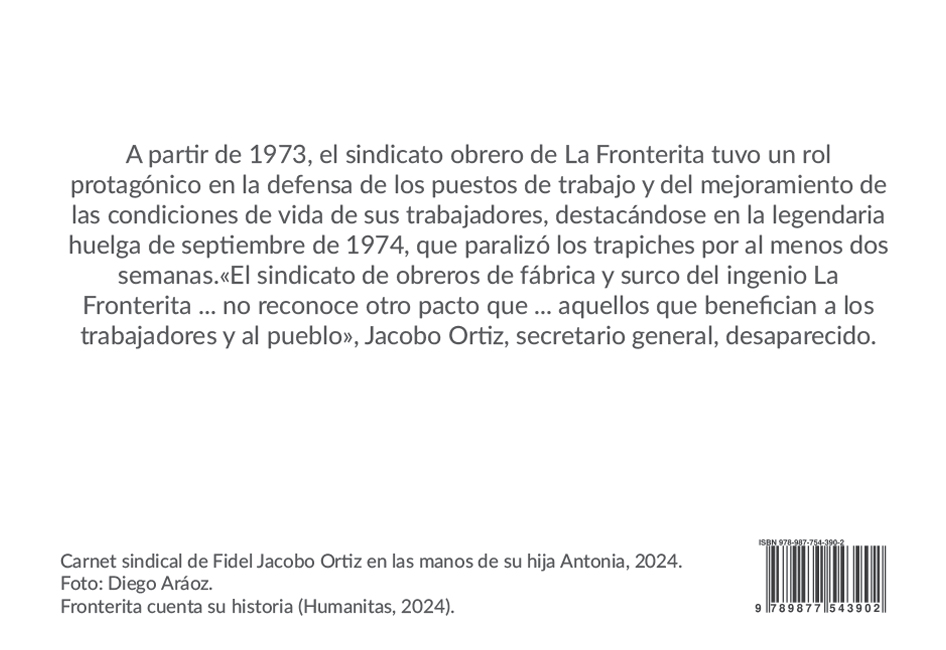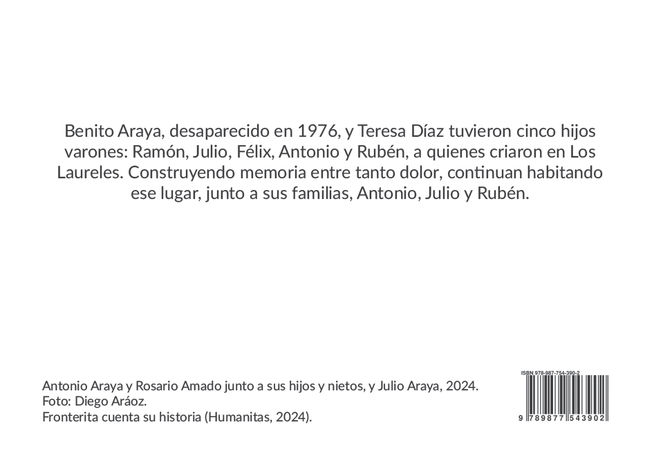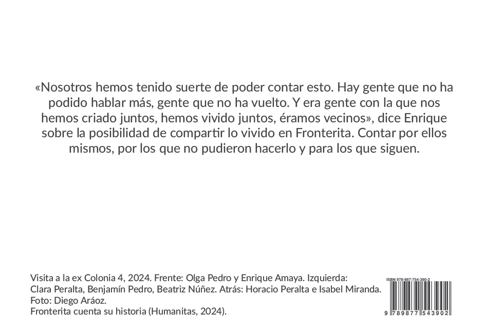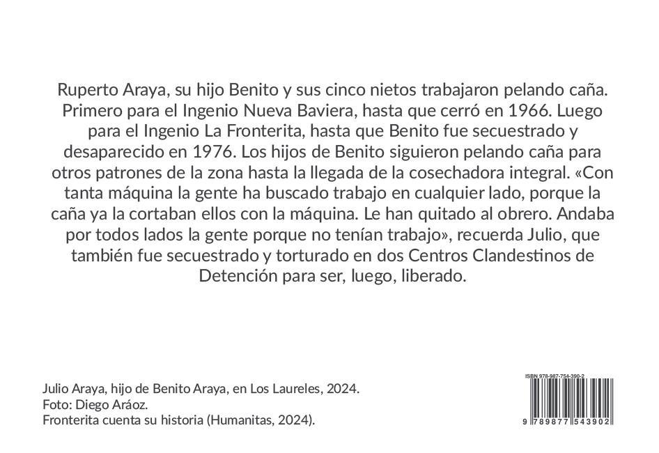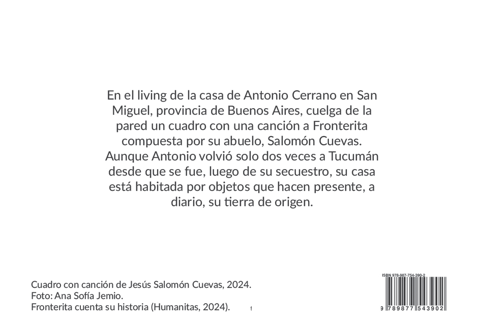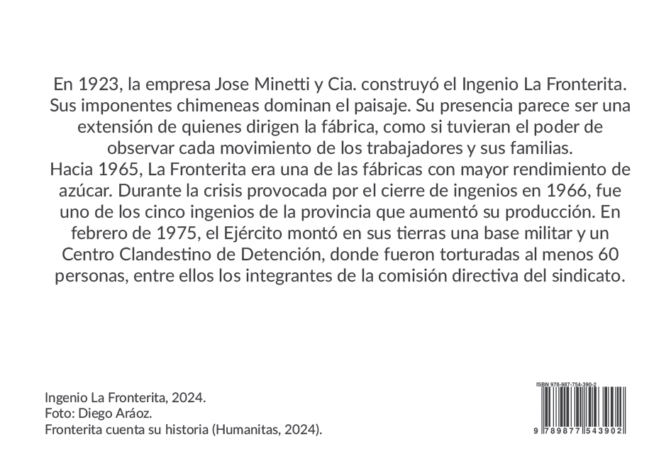 A través de voces, imágenes y recuerdos de los pobladores de Fronterita, este libro retrata la vida de una pequeña comunidad del sur tucumano, marcada por los cambios sociales de los sesenta y setenta y por el secuestro de sus seres queridos. Invita a recorrer esas tierras como un lugar donde buscar las raíces que sostienen el porvenir.